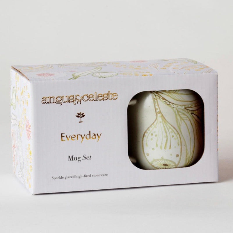 Angus & Celeste’s Everyday Mugs are crafted from high-fired stoneware and decorated with their original, botanically inspired, A&C artwork.
